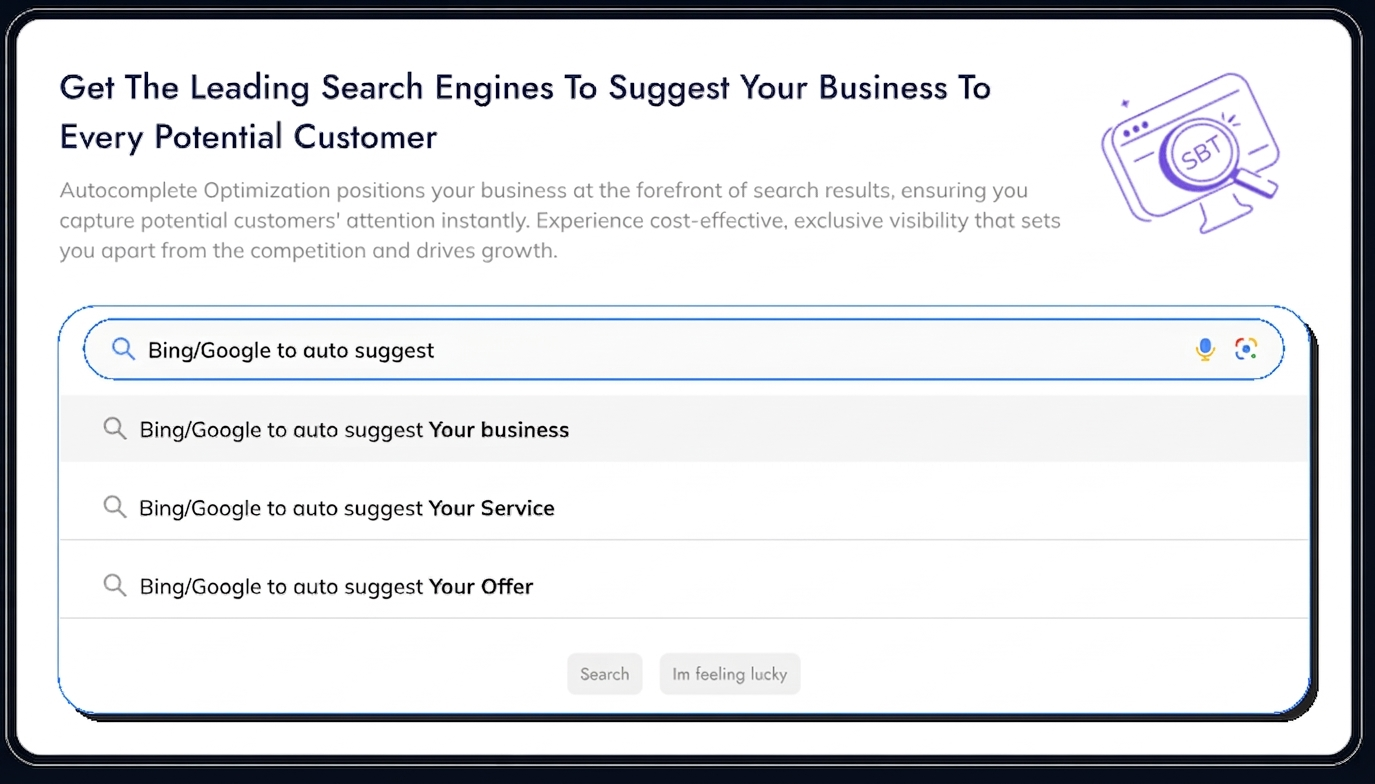Searching buyers will see your business suggested before they ever have a chance to see your competition. Get to buyers first with Autocomplete-Optimization.